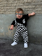 Waffle Ziggy Checkered Romper- Black & Greige